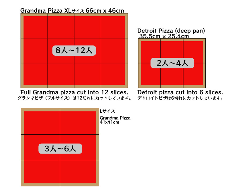 ニューヨークスタイルピザに加えて、グランマスタイルやデトロイトスタイルのパンピザもご用意しています。これらはご希望に応じてお作りします。